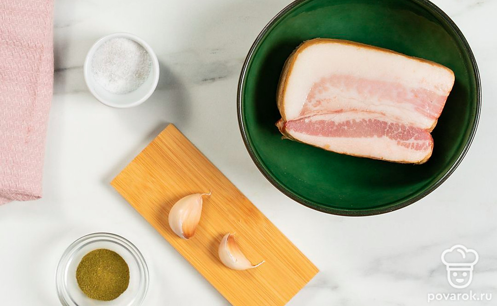 Разморозьте, помойте и обсушите сало. Помойте и почистите чеснок. Разогрейте духовку до 180 градусов. Подготовьте фольгу и небольшую форму для запекания.