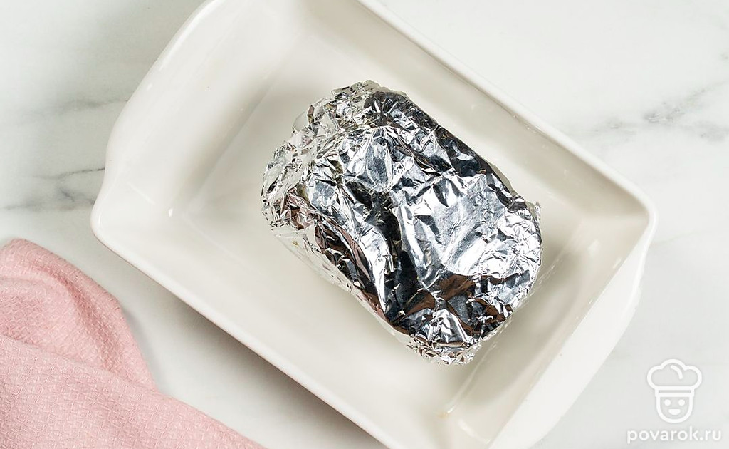 Плотно заверните сало в фольгу. Положите его в форму для запекания и отправьте в духовку на 1,5-2 часа. После этого полностью остудите сало перед подачей.