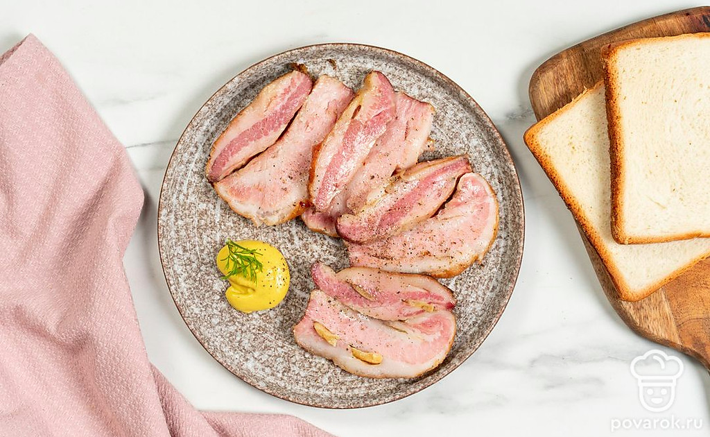Нарежьте сало тонкими ломтиками. Подайте его с горчицей, хреном, свежей зеленью и соленьями на ваш вкус.