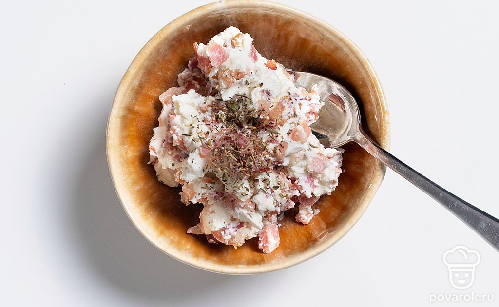 Выложите бекон в миску. Добавьте творожный сыр и итальянские травы по вкусу. Хорошо перемешайте начинку.