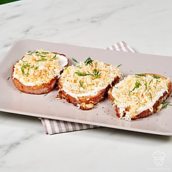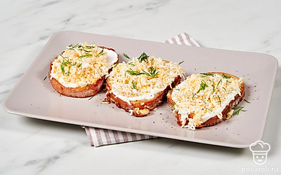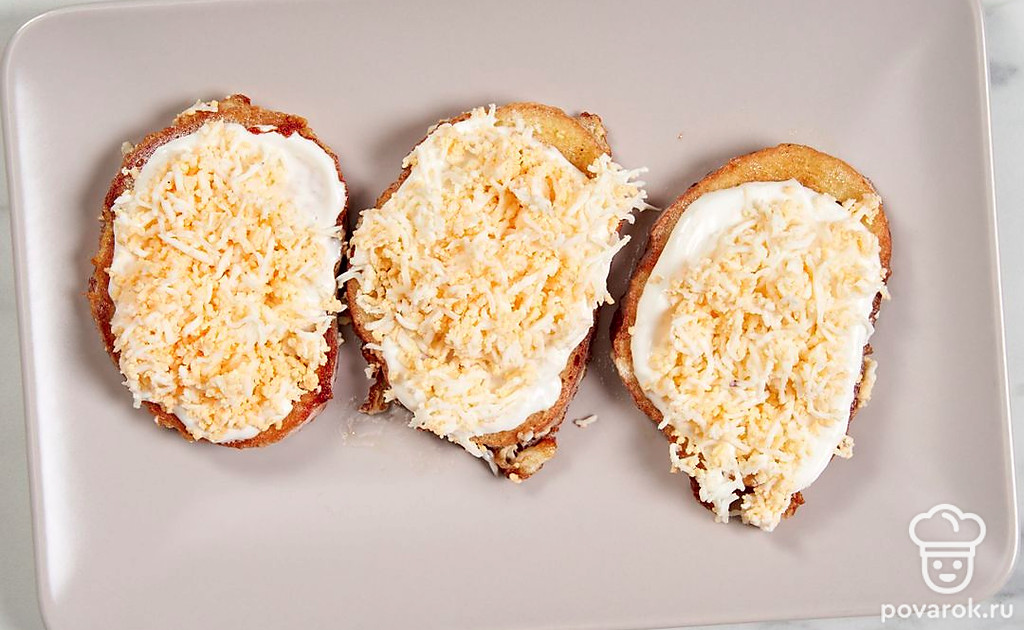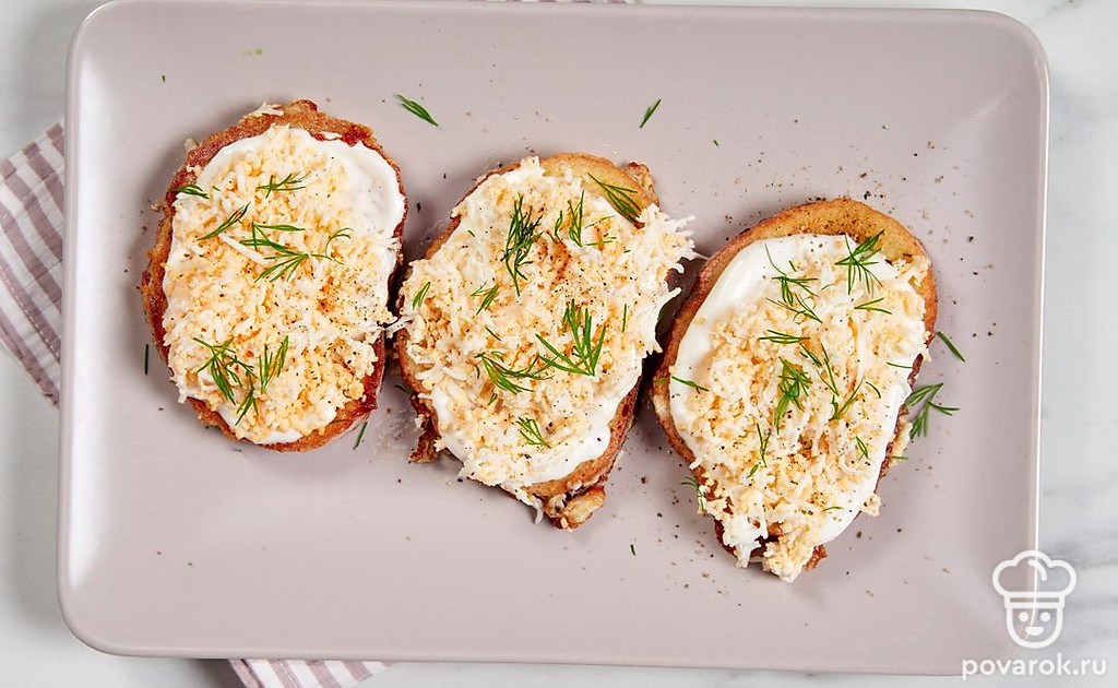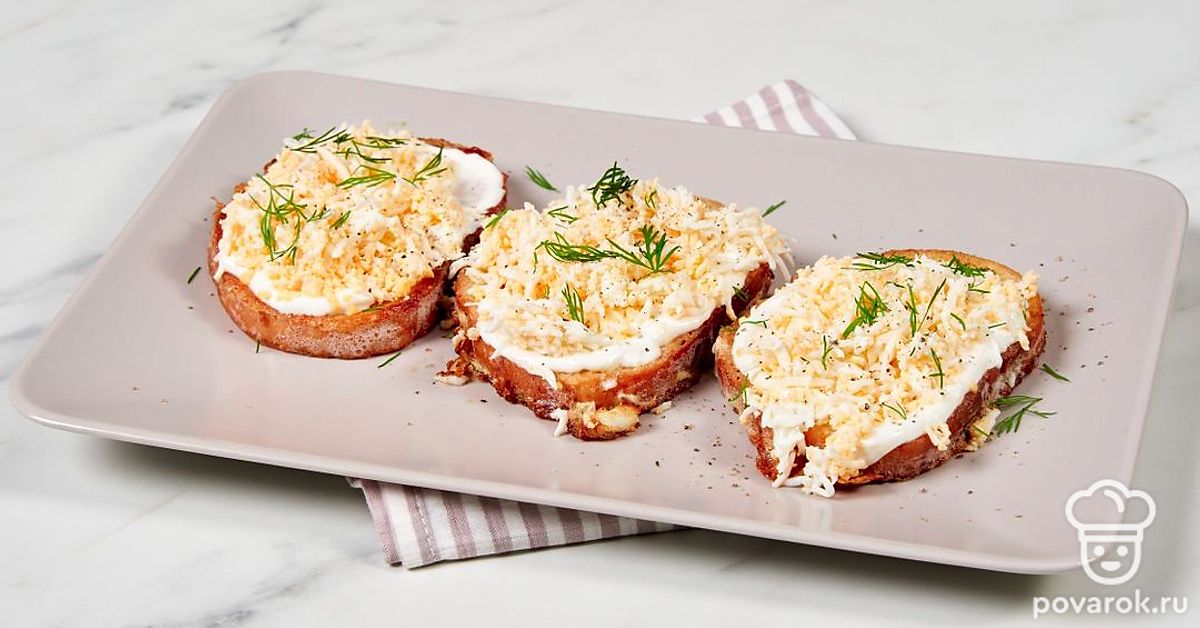 Смажьте каждый ломтик хлеба с одной стороны майонезно-чесночным соусом, а сверху посыпьте их измельченными яйцами. Выложите гренки натарелку для подачи.