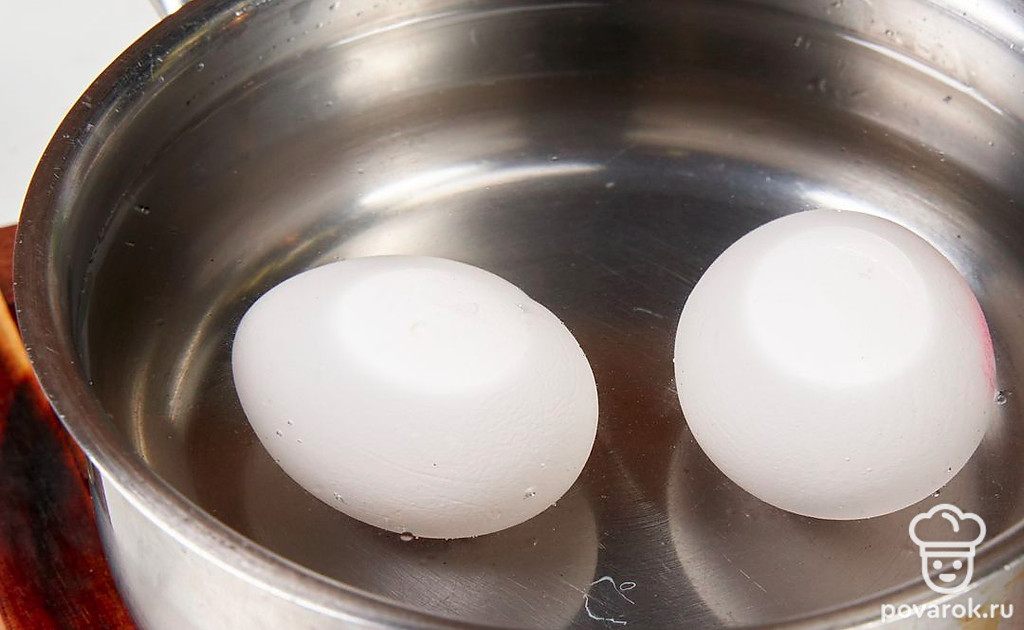 Выложите яйца в сотейник, залейте водой. Поставьте на сильный огонь. Как только вода закипит, приоткройте крышку и варите до готовности яиц 5-7 минут. Затем остудите их, почистите и натрите на мелкой терке.
