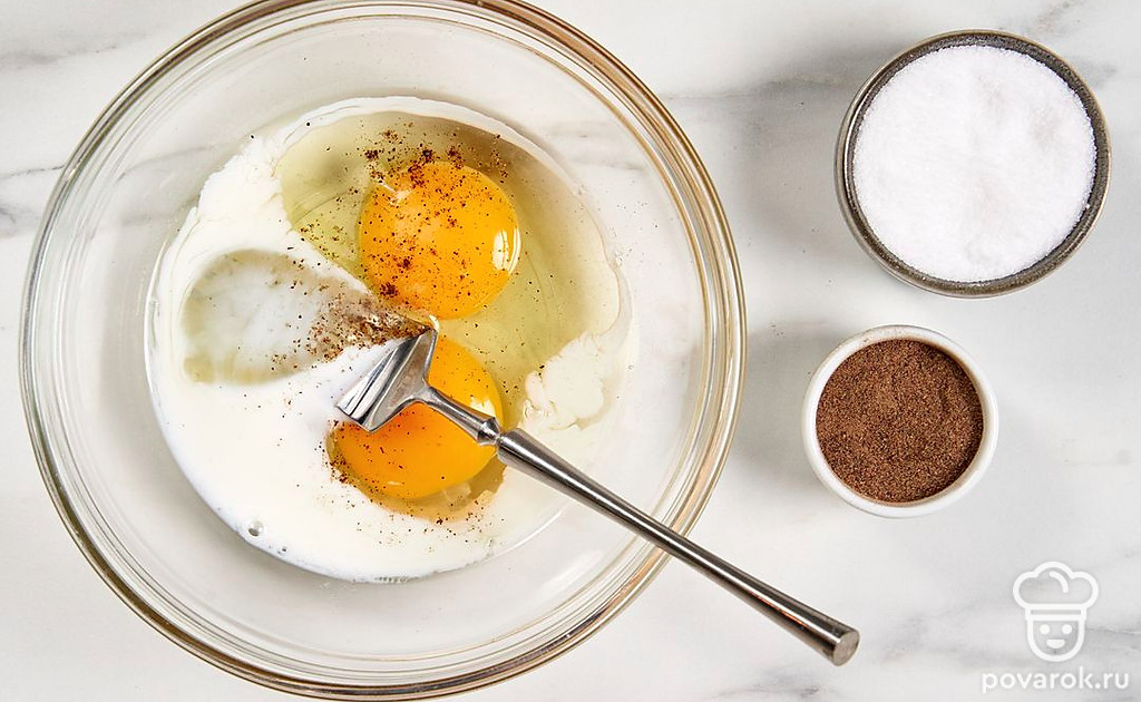 Разбейте оставшиеся 2 яйца в миску. Влейте к ним молоко. Посыпьте солью и перцем по вкусу. Взболтайте смесь вилкой до однородности.