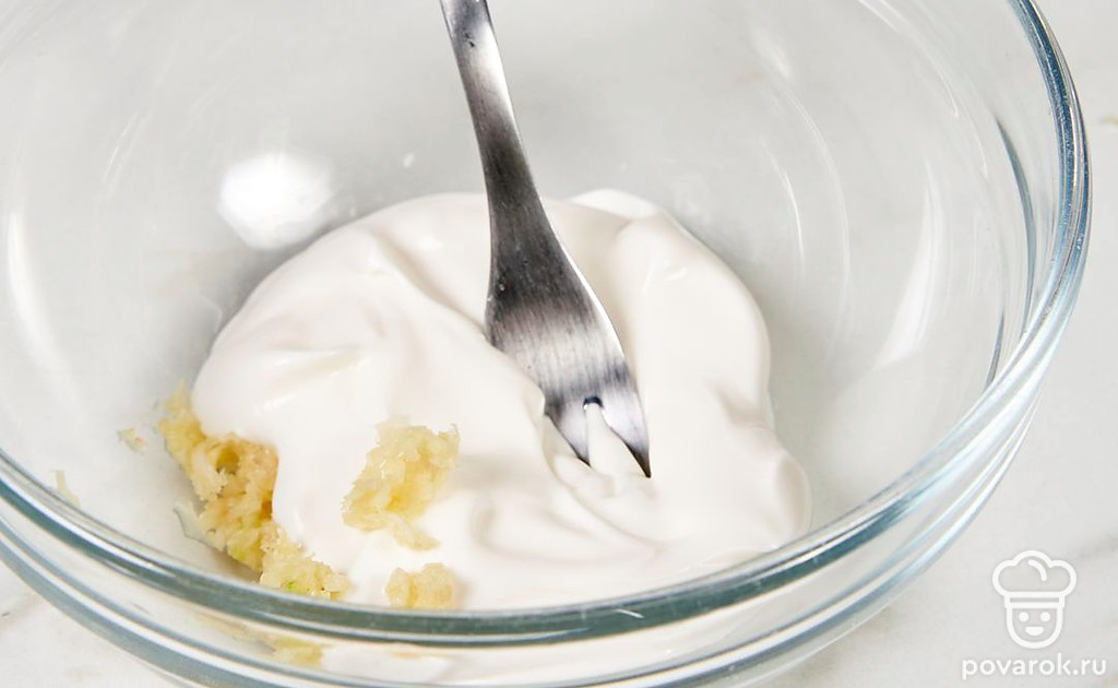 Выложите майонез в чистую миску. Пропустите чеснок через пресс. Перемешайте его с майонезом в миске.