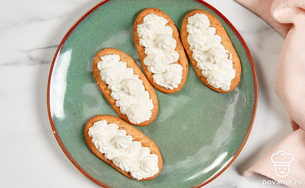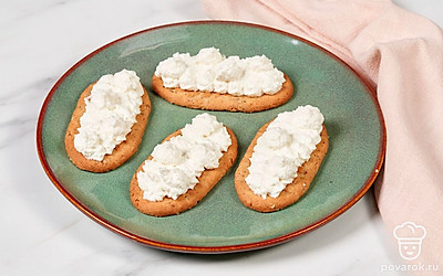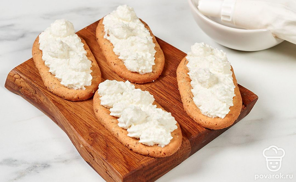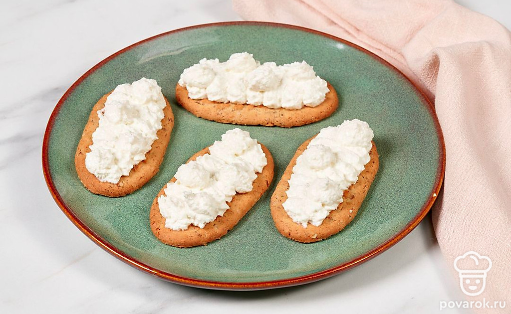 Наполните кондитерский мешок творожной массой. Выложите начинку на печенье.