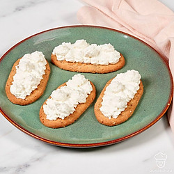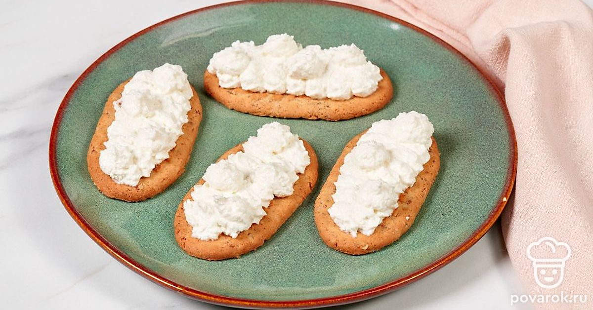 Простая закуска с творожным кремом и печеньем подойдет для легкого завтрака или быстрого перекуса вне дома. Готовить ее быстро и не сложно. Сначала нужно сделать творожный крем, а затем выложить на печенье. Можно взять любое: песочное, овсяное, затяжное или даже крекер. Мы решили добавить к творогу соль, но вы можете сделать закуску сладкой и положить сахар или сахарную пудру.