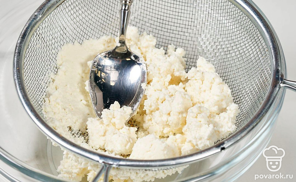 Протрите творог через сито. Благодаря этому он станет более воздушным.