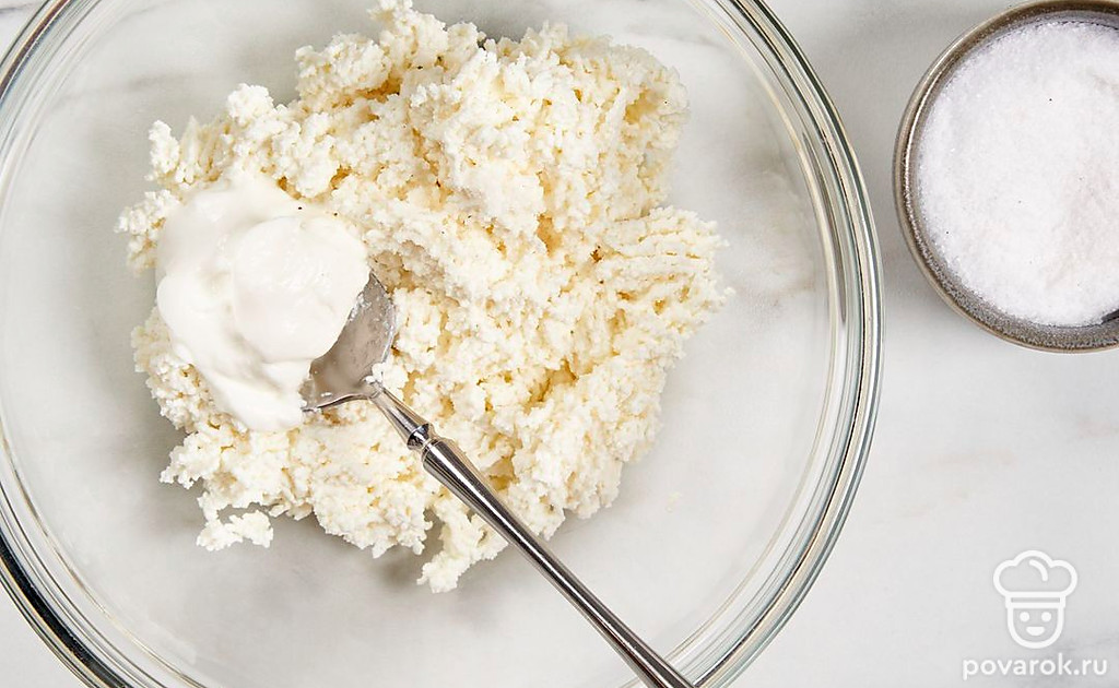 Добавьте к творогу сметану и немного соли. Тщательно перемешайте.