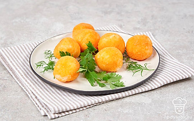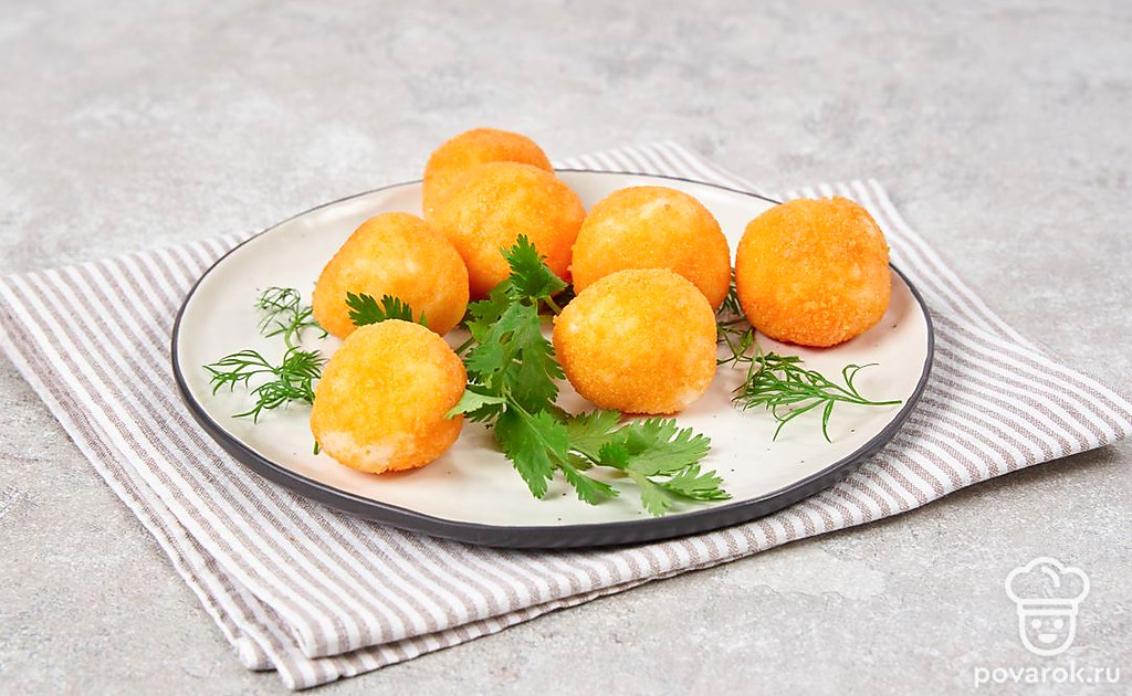 Для этого блюда понадобится рис, сливки и сыр. Сформированные из этих ингредиентов рисовые шарики обваливают в панировке и обжаривают до золотистого цвета.
