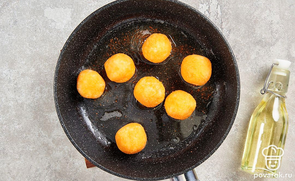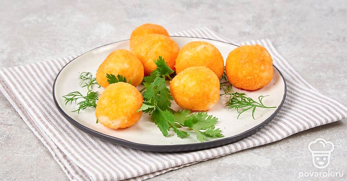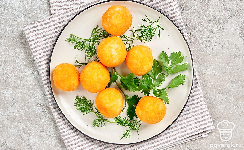 Насыпьте на рабочую поверхность муку и отдельно — панировочные сухари. Яйцо разбейте в блюдце. Обваляйте шарики в муке, обмакните в яйцо, обсыпьте панировочными сухарями.
