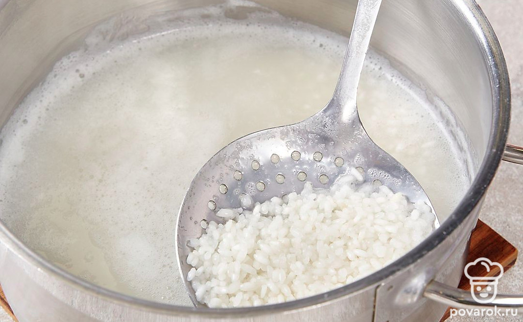 Рис выложите в кастрюлю с подсоленной водой. Дождитесь кипения и отварите крупу до готовности в течение 20-25 минут.