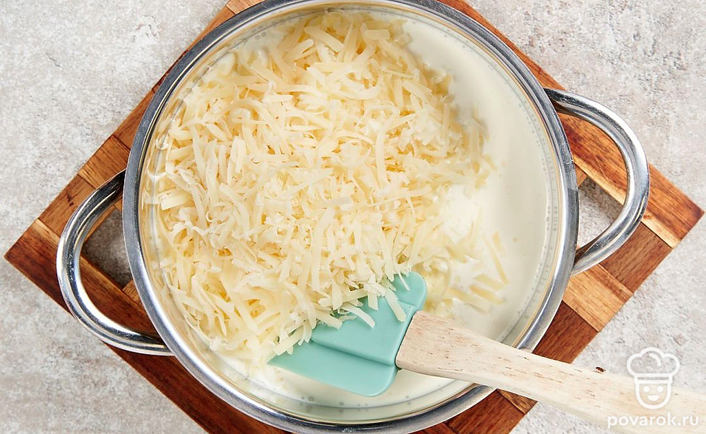 Натрите сыр на средней терке. Сливки перелейте в ковшик или кастрюльку, поставьте на огонь и добавьте в них тертый сыр. Помешивайте, пока он не расплавится.