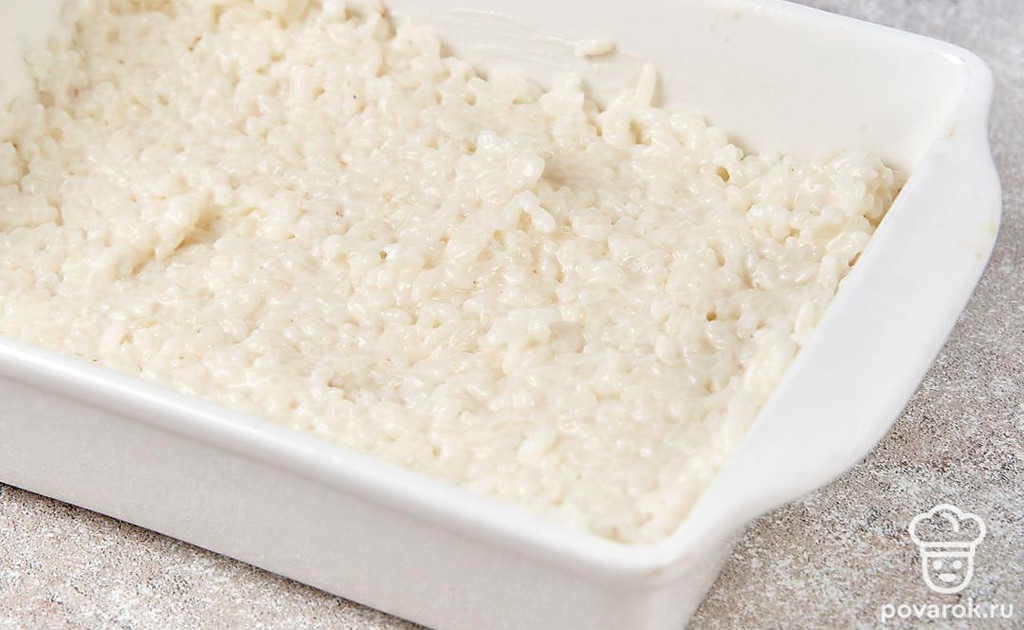 Выложите рис в форму, утрамбуйте и поставьте в холодильник.