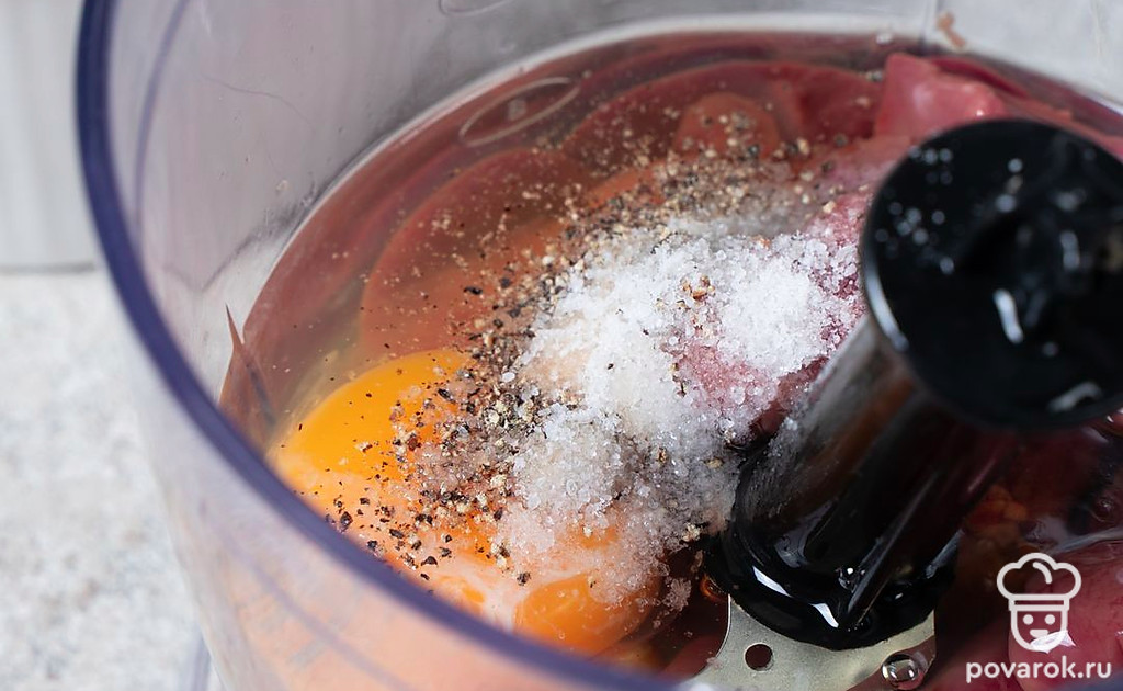 Выложите кусочки печени в чашу блендера. Добавьте туда яйца, муку и немного специй. Пробейте ингредиенты до однородности.
