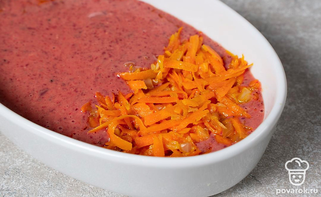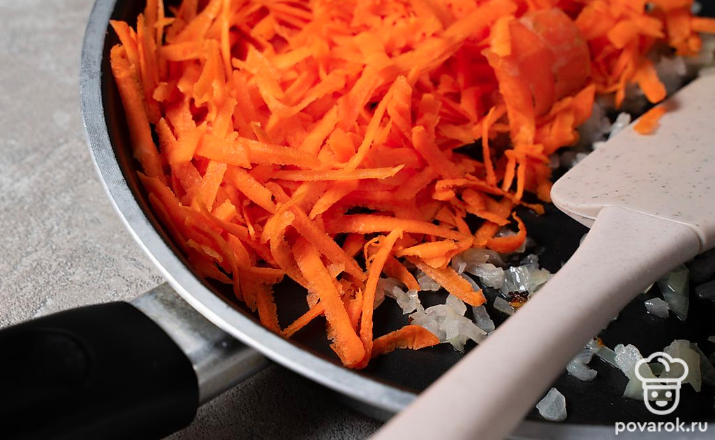 Натрите и выложите морковь в сковороду к луку. Перемешайте и готовьте зажарку еще 5-6 минут до мягкости, а после уберите сковороду с плиты. Добавьте к овощам соль и перец, а затем еще раз тщательно перемешайте ингредиенты.