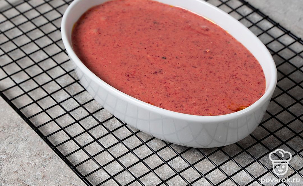 Измельченную печень разделите на 3 части. Первую часть влейте в форму и распределите по всей поверхности. Поверх слоя печени выложите половину зажарки. Чередуйте слои, пока ингредиенты не кончатся.