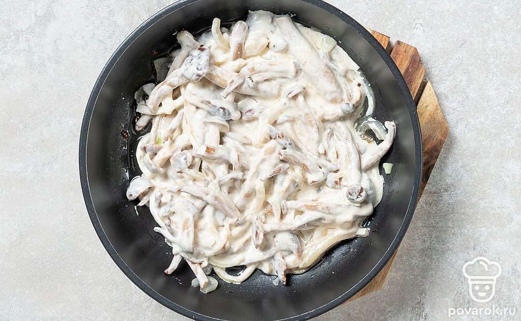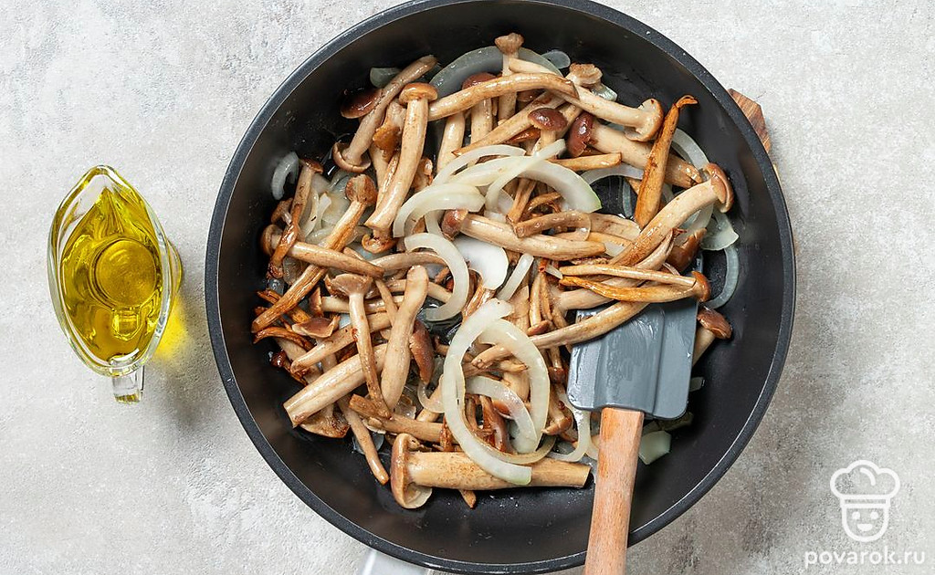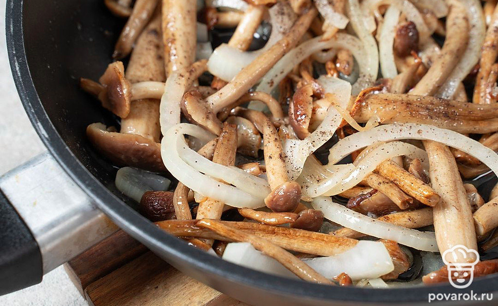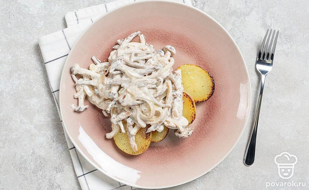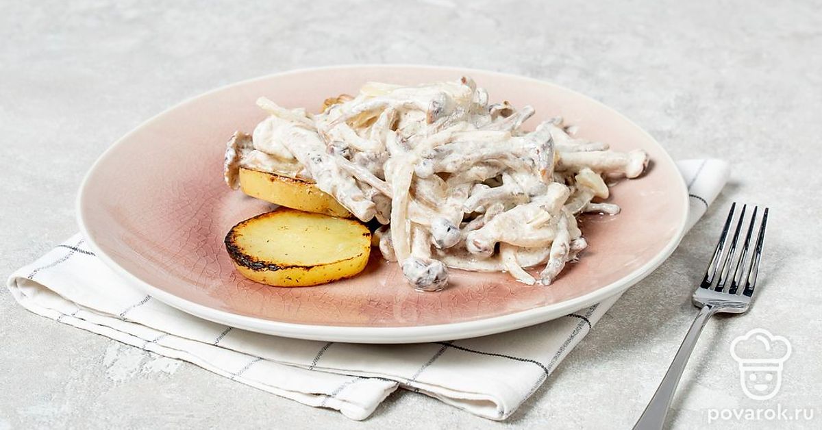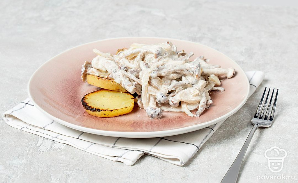 Деликатные крохотные опята не требуют долгой жарки и тушения. Для их приготовления потребуется всего 15 минут. Этого времени хватит, чтобы грибы успели взять все самое лучшее от вкуса и запаха лука, а также пропитались приятной кисловато-сливочной ноткой сметаны. Мягкий травянистый вкус грибов хорошо раскроется, если дать им после приготовления немного постоять.