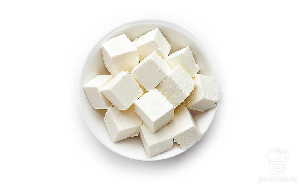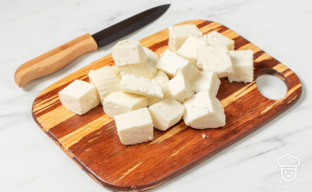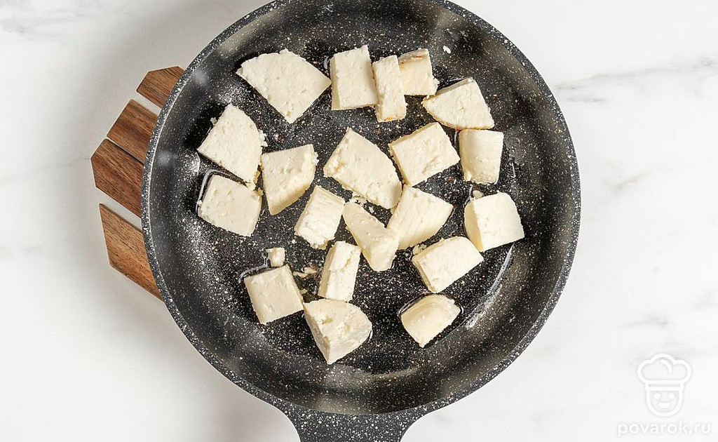 Добавьте в сковороду 1 ст.л. растительного масла. Поставьте ее на средний огонь и разогрейте. Панир нарежьте небольшими кубиками.