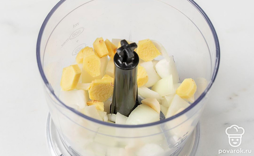 Лук нарежьте крупными кусочками и добавьте в чашу блендера. Туда же положите чеснок и имбирь. Пробейте ингредиенты до однородной массы.