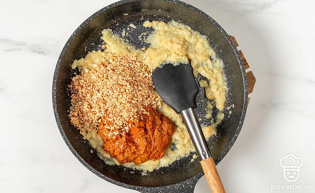 Когда лук станет золотистым, добавьте пасту корма и измельченный миндаль. Перемешайте. Готовьте соус еще 2 минуты до загустения.