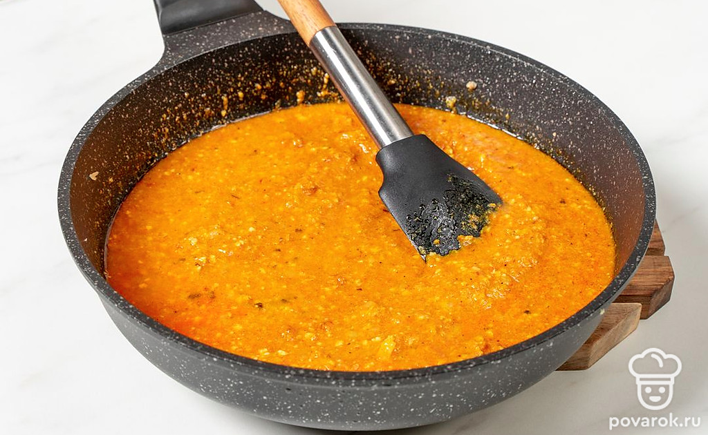 Влейте в сковороду воду. Дождитесь, когда она закипит, а затем проварите соус еще 5-10 минут на небольшом огне.