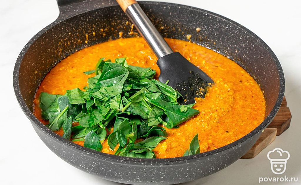 Шпинат измельчите и выложите в сковороду к другим ингредиентам. Тушите соус еще 5 минут.