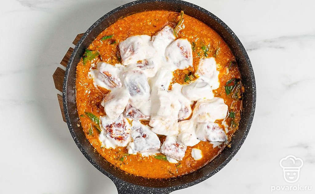 Поджаренный панир смешайте с йогуртом и добавьте в соус. Перемешайте и снимите с огня.