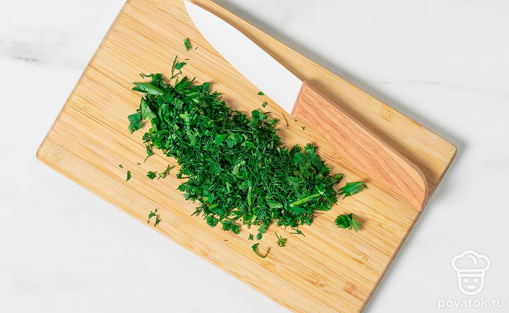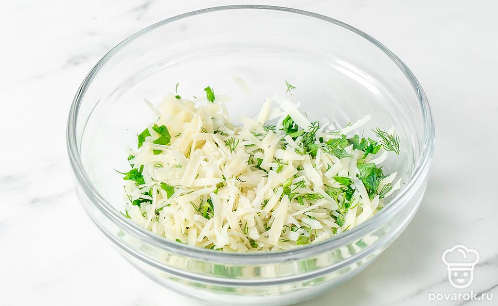Зелень помойте и обсушите. Возьмите для пирожков лук, укроп, петрушку, шпинат, рукколу, базилик — что больше нравится. Для начинки отлично подойдет сыр пармезан, гауда, тильзитер или российский, но и с другими видами получится не менее вкусно.