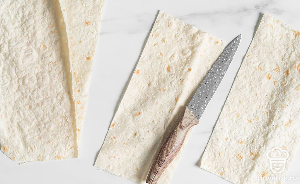 Разрежьте лист лаваша на 4-5 полосок шириной примерно 9-10 см и длиной 40-50 см. Тоньше резать не стоит, иначе начинку будет трудно заворачивать. Для нарезки используйте обычный нож или круглый нож для пиццы.