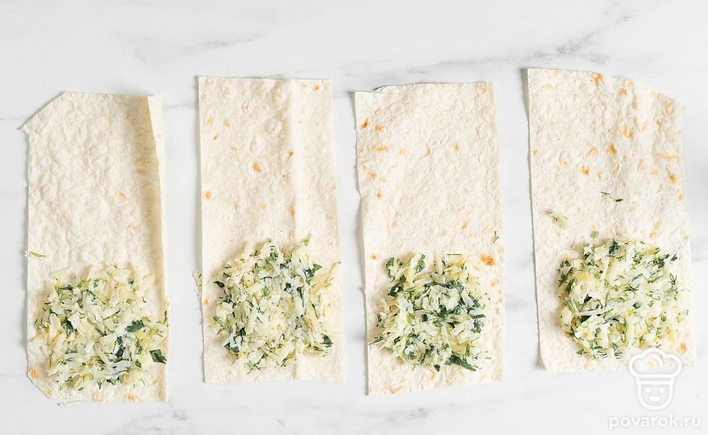 Если класть сырную начинку на 2/3 длины лаваша, пирожки получатся сочнее.