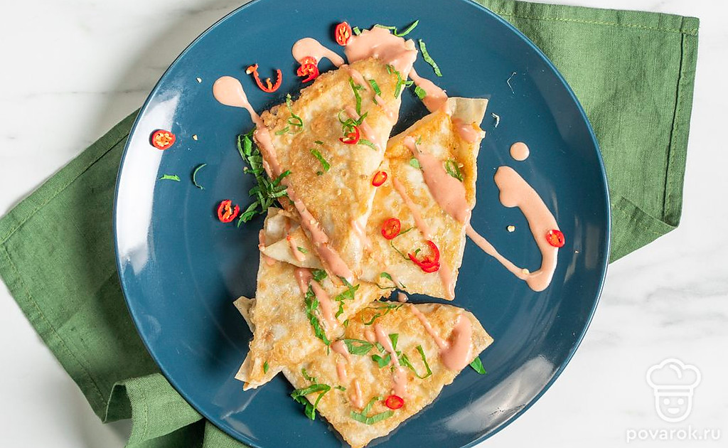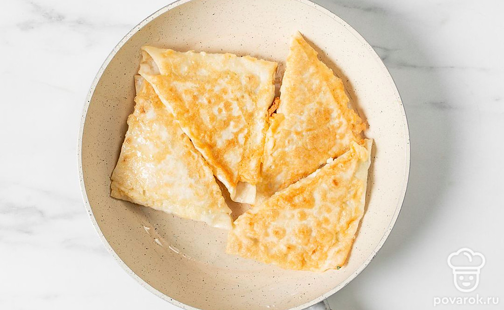 Жарьте пирожки с каждой стороны по 1-2 минуты до золотистой корочки. Если лаваш начнет гореть, убавьте огонь.