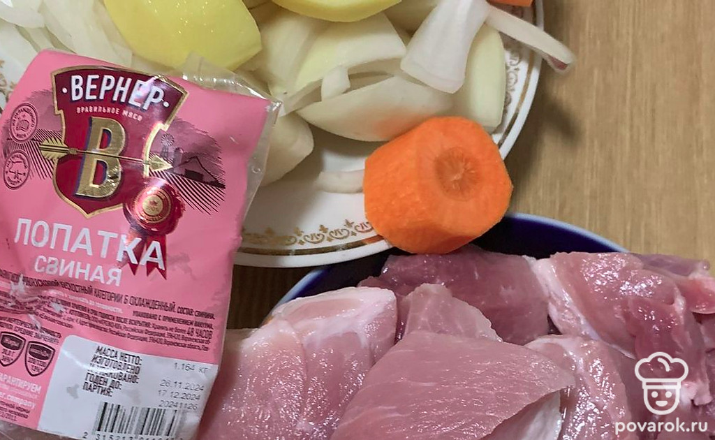 Очистите овощи. Нарежьте овощи и мясо кусочками.
