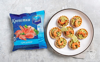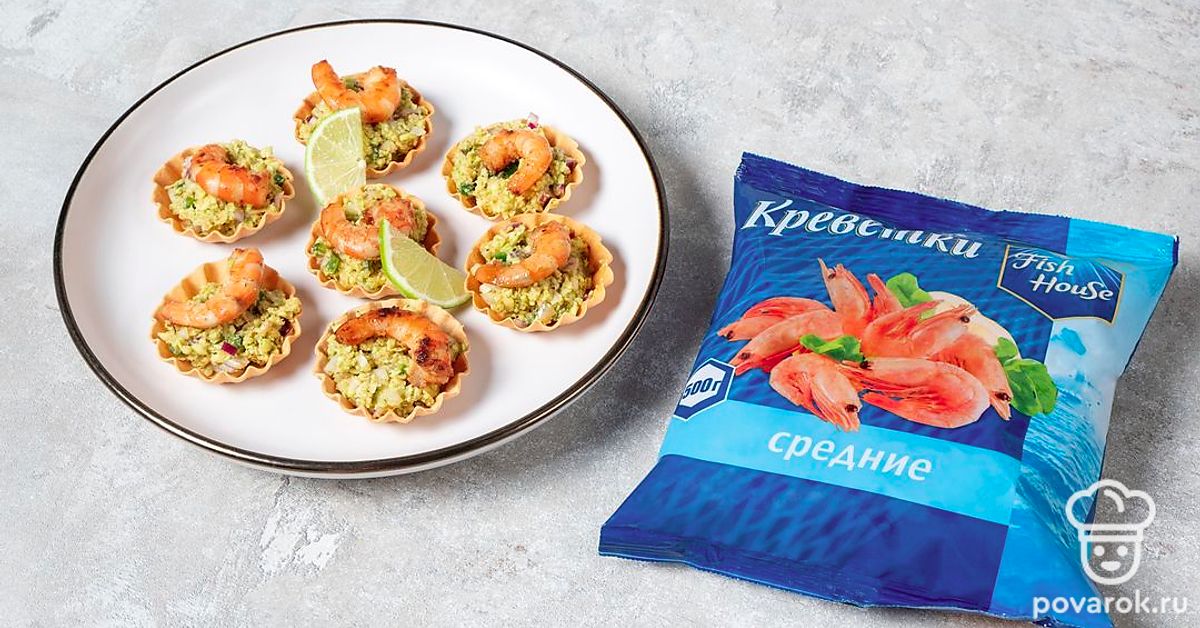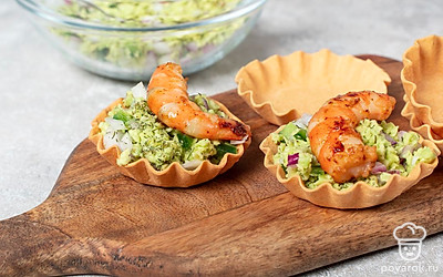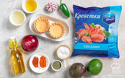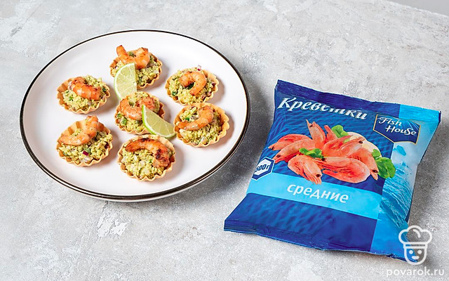С гуакамоле можно приготовить множество блюд. Особенно хороши с этим соусом всевозможные закуски. Смотрятся они очень красиво и аппетитно благодаря нежному зеленому цвету. Для соуса измельчите и смешайте все ингредиенты. Должна получиться густая, очень вкусная паста. Креветки полчаса подержите в маринаде из оливкового масла, лаймового сока и специй. Останется только положить в каждую тарталетку немного гуакамоле и выложить сверху одну-две креветки.