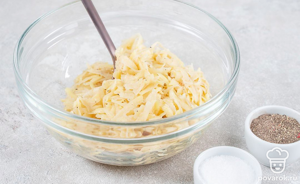 Натрите картофель на терке и отожмите сок. Добавьте желток, посолите, поперчите и перемешайте массу.