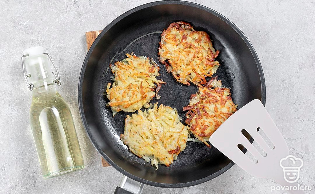 Разогрейте сковороду с маслом. Выложите несколько ложек картофельного теста и разровняйте кружочки. Обжарьте драники по 5 минут с обеих сторон до аппетитной корочки и выложите на бумажную салфетку.
