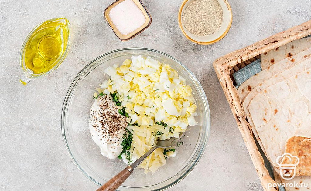 4 яйца отварите вкрутую, очистите и измельчите. Поставьте разогреваться духовку до 190 градусов. Порубите лук, укроп и петрушку. Сыр натрите на терке. Все смешайте, добавьте сметану, соль и перец. Перемешайте начинку.