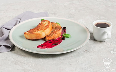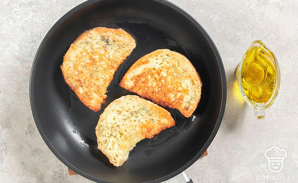 Приготовьте гренки. Сковороду с маслом поставьте на огонь разогреваться. Затем обмакните хлеб в молочно-яичную смесь и выложите на сковороду. Обжаривайте гренки с двух сторон до появления корочки.
