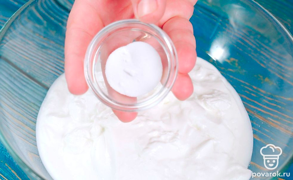 Всыпьте 7 г пищевой соды к йогурту комнатной температуры и перемешайте. Оставьте на 3-5 минут.
