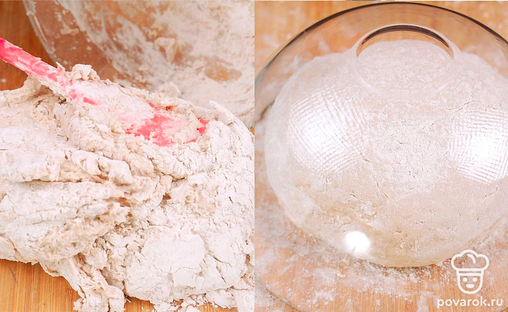 Долго вымешивать тесто не нужно, иначе выпечка получится жесткой. Готовое тесто должно слегка липнуть к рукам. Накрыть его миской и оставить отдохнуть на 10-15 минут. Тесто получается очень мягким.