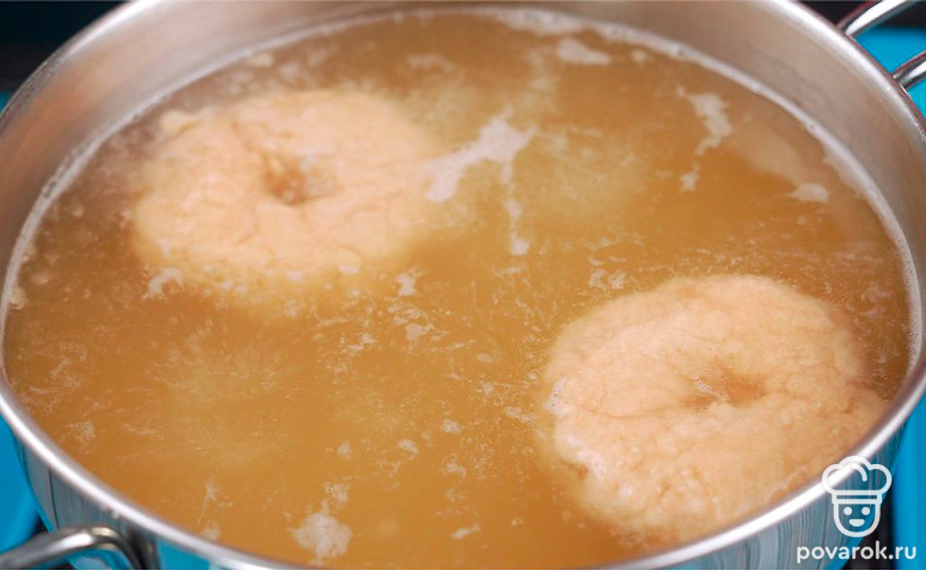 В кипящую воду опустите круглые заготовки по очереди. Как только бейгл всплывет, отсчитайте 3-4 секунды и достаньте при помощи шумовки. Стряхните лишнюю воду и выложите на противень, застреленный бумагой для выпечки. Таким образом сварите все заготовки. Выпечка после такой процедуры будет более пористой, а корочка сверху — румяной и хрустящей.