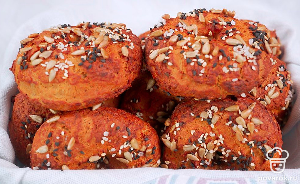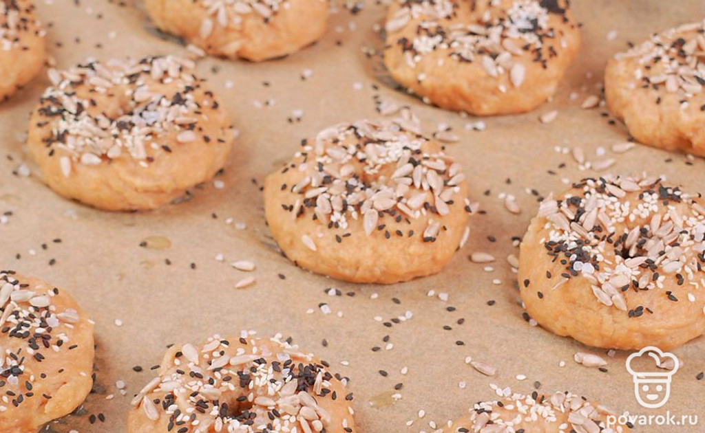 Посыпьте бейглы черным и белым кунжутом, подсолнечными семечками, а так же крупной солью. Выпекайте бейглы в разогретой до 180°C духовке 25-30 минут.