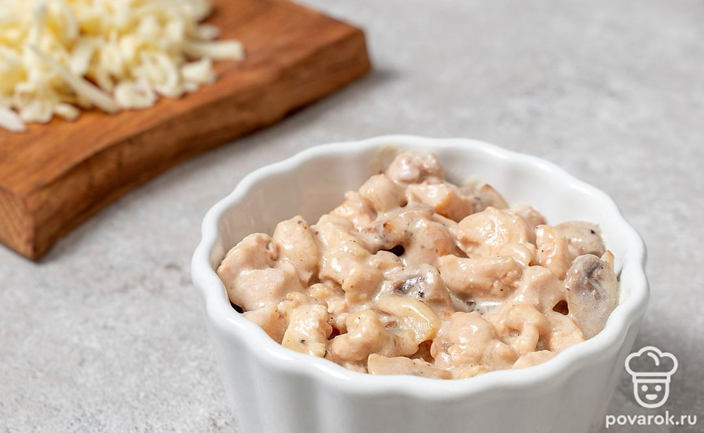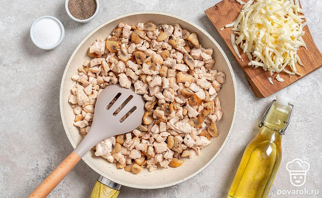 Начните готовить жульен. Нарежьте филе небольшими кубиками, а грибы — ломтиками. Сыр натрите на терке. Обжарьте курицу на масле минуты 4, пока она не побелеет. После чего всыпьте грибы и жарьте 10 минут до готовности шампиньонов.