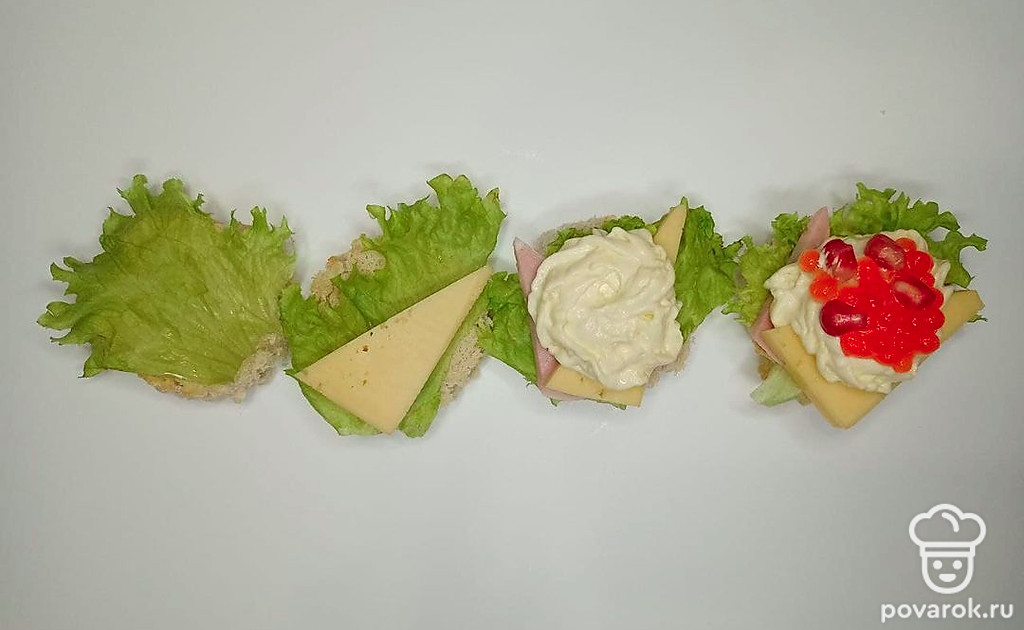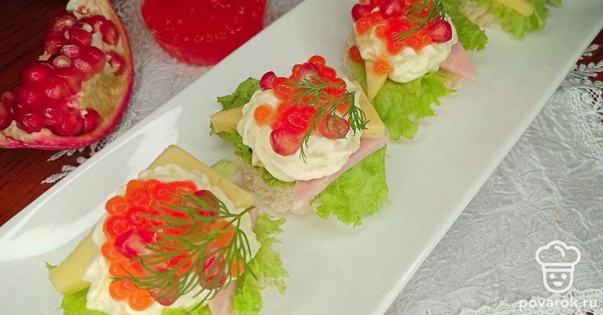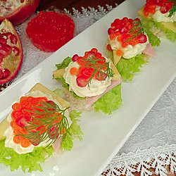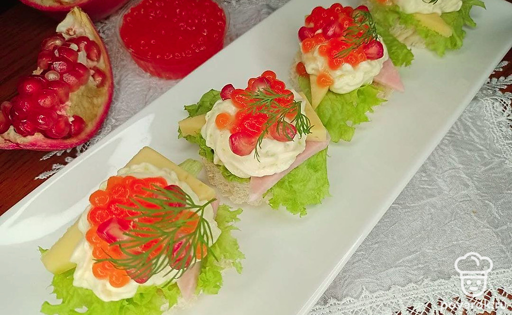 На подсушенные кусочки хлеба положите лист салата, тонко нарезанные кусочки ветчины и твердого сыра, подготовленный соус. В завершении украсьте красной икрой и зернами граната.