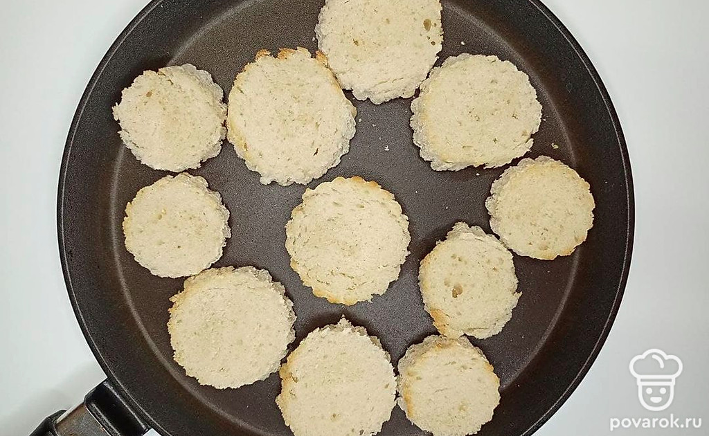 Батон нарежьте кусочками и выдавите из них мякиш вырубкой круглой формы. Сбрызните оливковым маслом и просушите на сковороде либо в духовке.