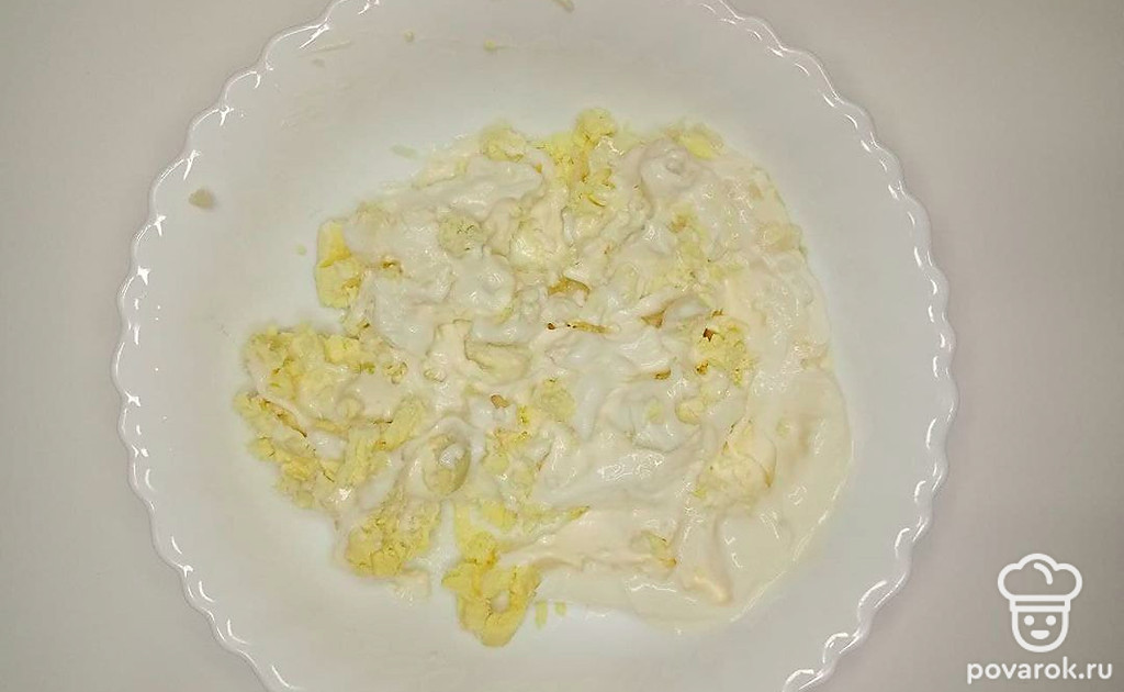 В тарелке соедините куриные желтки, измельченный чеснок, сливочный сыр и майонез. Все хорошо разомните вилкой, посолите и поперчите на свой вкус и перемешайте до однородности.