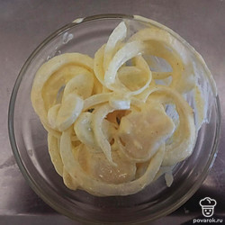Добавьте маринад к луку и перемешайте, дайте постоять 20 минут.