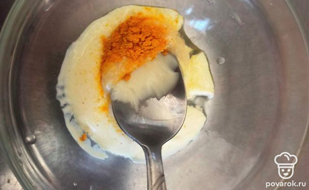 Для маринада смешайте майонез со столовым хреном, куркумой и щепоткой соли.