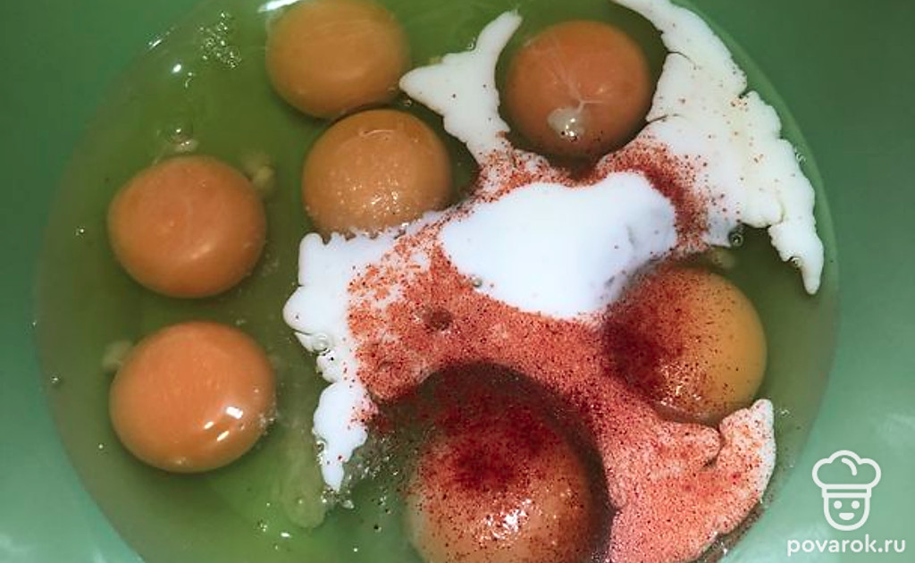 Яйца разбиваем в глубокую миску, добавляем соль, паприку и молоко. У меня яйца были мелкие, поэтому взяла 7 штук. Если попадаются крупные, достаточно 6 штук.