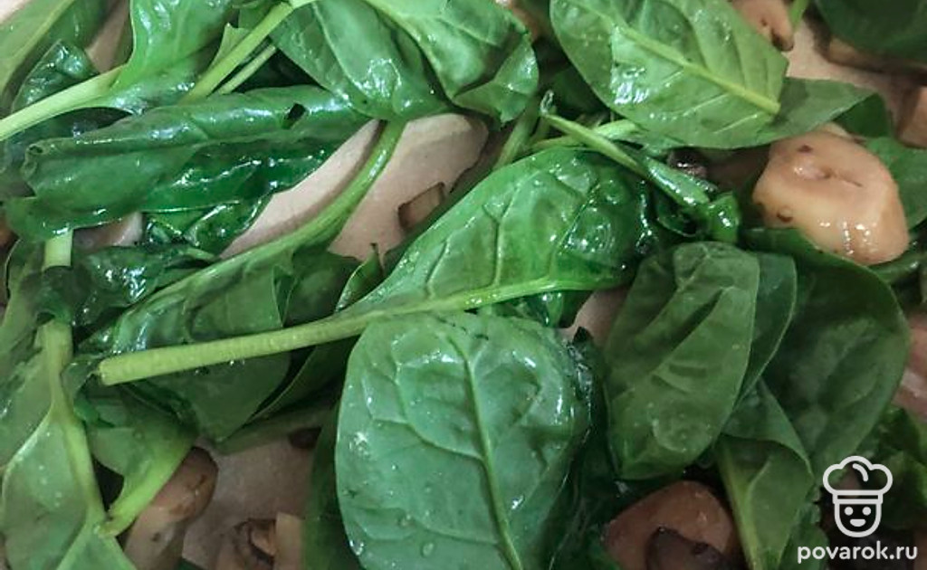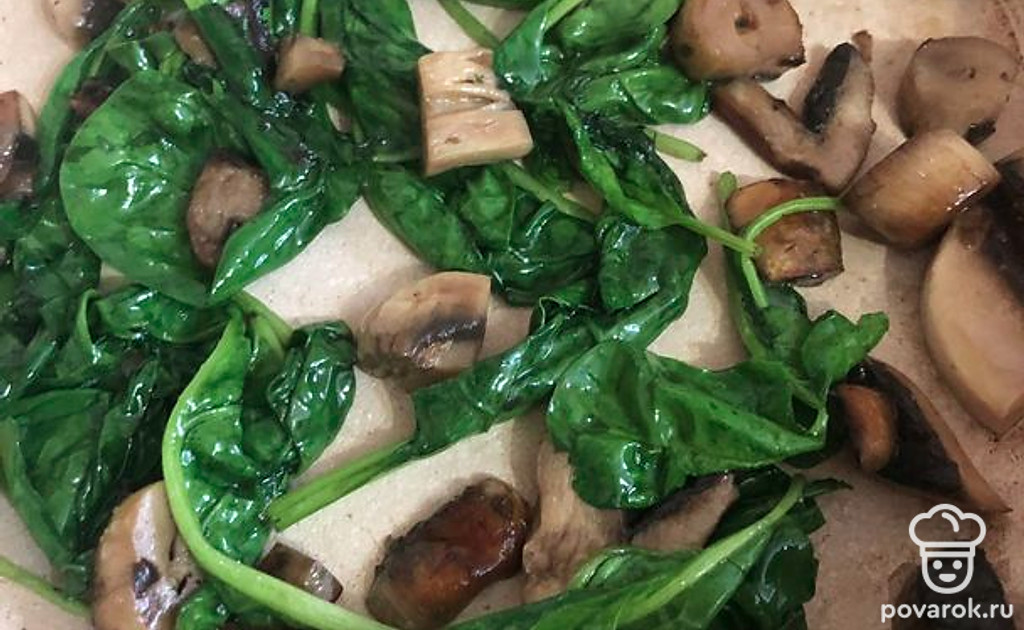 В сковороде на оливковом масле обжариваем грибы в течение 5-7 минут. Затем добавляем к ним шпинат и держим на огне еще минутку.
