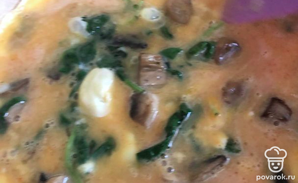 Как только шпинат уменьшится в размере, вливаем яичную смесь.